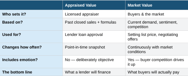 Think of it this way: if three buyers compete for your home and the winning offer comes in $25,000 above asking, that final sale price is your market value. An appraiser, working from older closed sales, might not validate that price on paper — which is exactly where things can get complicated.
