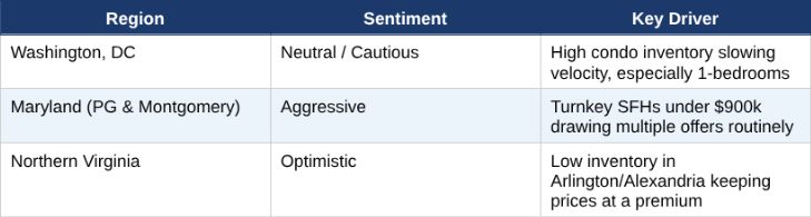Meanwhile, DC's condo market — especially one-bedroom units — is repeatedly cited as the slowest-moving segment in the region. High inventory at the $1M+ level in DC proper is also dampening velocity for higher-end urban product.
