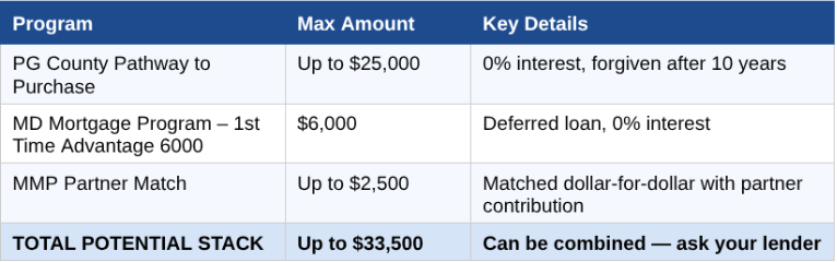 The real power here is that you can combine these programs. Here's what the stack can look like for an eligible PG County buyer in 2026: