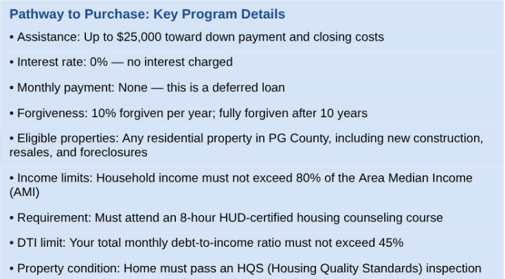 This is the big one. PG County's Pathway to Purchase program provides up to $25,000 in down payment and closing cost assistance for eligible first-time buyers purchasing anywhere in the county. The assistance comes as a 0% interest, deferred payment loan — meaning no monthly payments. The loan amount decreases by 10% per year, and after 10 years it's completely forgiven and the lien is released. If you stay in the home for 10 years, this money is essentially free.