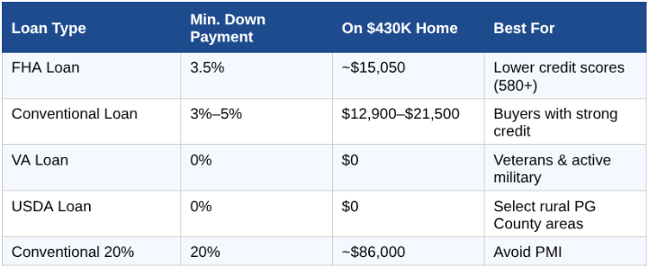 Your minimum down payment depends on the type of mortgage loan you use. Here's how the most common loan types break down for a PG County home purchase in 2026: