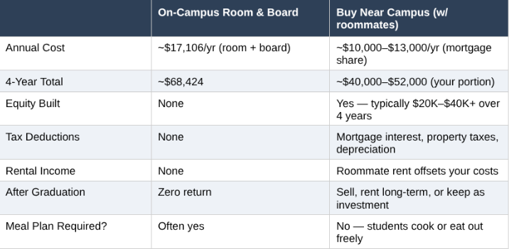 Even a 2-year ownership period can make financial sense if the purchase price is right and roommates contribute to costs. At a minimum, you're not writing tuition-level checks to a dormitory with zero return. And if your student's plans change, the property can be rented at market rate or sold — giving you flexibility that a room-and-board contract doesn't.