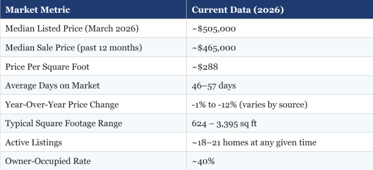 As of early 2026, the median listed price is approximately $505,000, with median sale prices over the past 12 months running closer to $465,000. The range is significant: unrenovated historic bungalows start in the $350,000s to $400,000s, while fully renovated craftsman homes and larger colonials trade at $550,000-$650,000 and above. Price per square foot averages approximately $288. Inventory is thin — typically 18-21 active listings — so monthly statistics can be volatile.