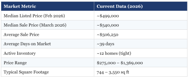 As of early 2026, median listed prices are approximately $499,000, and median sale prices for single-family homes are running around $540,000. The range is wide — from the mid-$200,000s for properties needing significant work to over $1 million for the best-renovated historic homes. Average days on market is approximately 39 days.