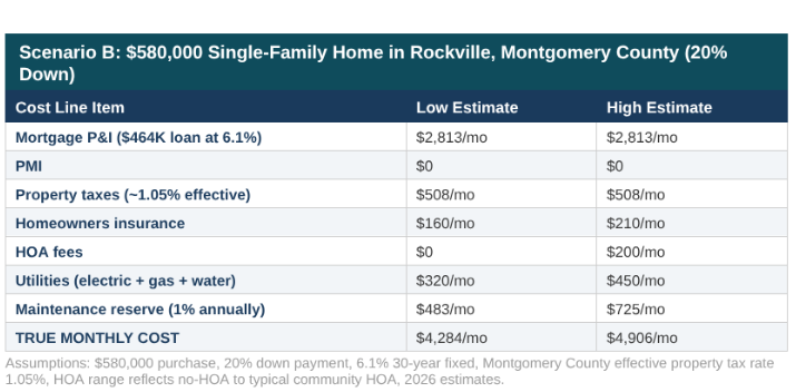 For a typical $580,000 single-family home in Montgomery County with 20% down at today's rates, total true monthly costs run approximately $4,300–$4,900 per month — including mortgage P&I (~$2,813), property taxes (~$508), homeowners insurance (~$160–$210), HOA fees (varies by community, $0–$200+), utilities (~$320–$450), and a maintenance reserve (~$483–$725). The most variable line items are HOA fees and maintenance — an older home without an HOA can run close to $4,300/month; a newer community with a full HOA and higher maintenance needs can push toward $5,000.