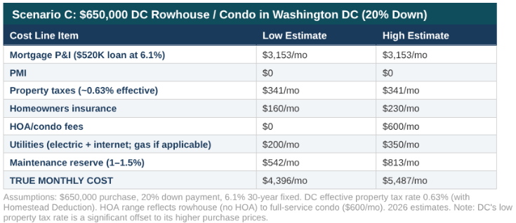 For a $650,000 DC condo with 20% down, the true monthly cost runs approximately $4,400–$5,500 depending heavily on HOA fees. The mortgage P&I is approximately $3,153/month. DC's low property taxes add about $341/month. Homeowners insurance is modest ($160–$230/month). But condo HOA fees range from $200 to $600+/month in DC's building stock, and that range is the primary driver of variation. Higher HOA fees in full-service buildings often include amenities and building maintenance that offset some costs, but they also tend to rise annually. Always calculate the full all-in monthly cost before comparing condo options.