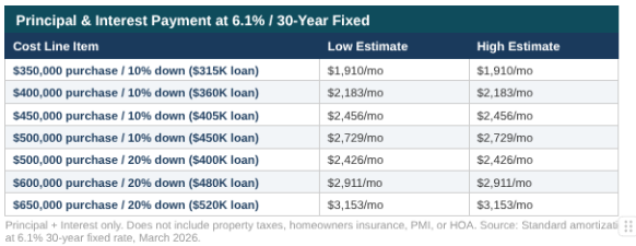 At the current 30-year fixed rate of approximately 6.1% (Freddie Mac, mid-March 2026), here's what principal and interest alone look like at different purchase prices and down payment scenarios: