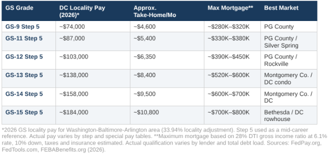 GS-12 and GS-13 employees — the largest single cohort of federal workers in the DC area — can realistically access most of Montgomery County's mid-tier market and much of Prince George's County, though Bethesda and Chevy Chase remain out of reach at these income levels without significant down payment reserves or a dual-income household.