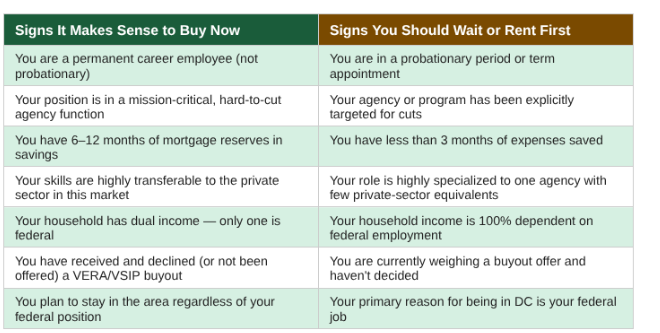 Here's the question I ask every federal buyer who's on the fence: 'If you lost this job, what would happen?' If the answer is 'I'd find another position in this market within a few months and could cover the mortgage in the meantime with savings,' that's a manageable risk. If the answer is 'I'd have to move and would need to sell quickly,' that's a different calculation — and renting first is the right call.